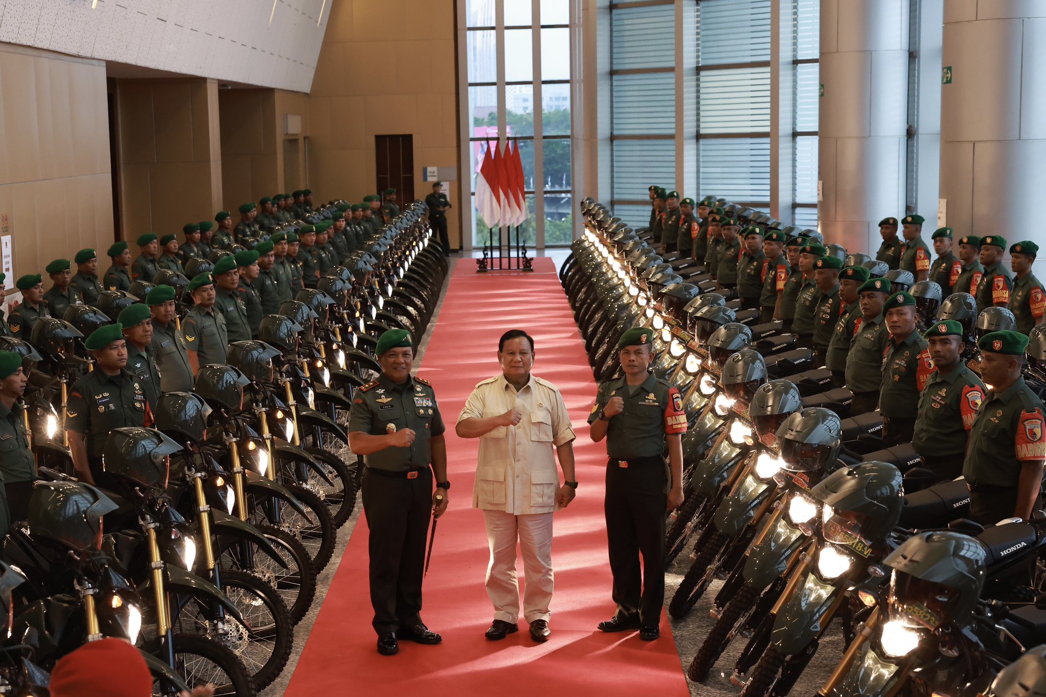 Menteri Pertahanan (Menhan) Prabowo Subianto menyerahkan bantuan sebanyak 100 unit kendaraan jenis sepeda motor trail untuk operasional Bintara Pembina Desa (Babinsa) di wilayah Jawa Timur.
