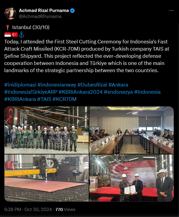 (X)Dari laman X Duta besar Indonesia untuk Turki memberitakan bahwa telah menghadiri upacara pemotongan baja pertama Fast Attack Craft Missiled (KCR-70M) untuk Indonesia yang diproduksi oleh perusahaan Turki TAIS pada tanggal 30 Oktober 2024 di Galangan Kapal Şefine.
